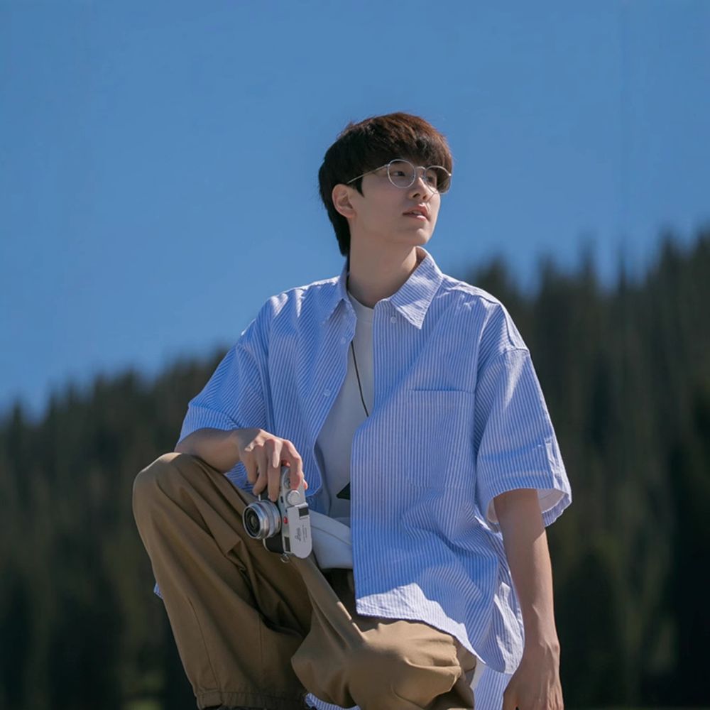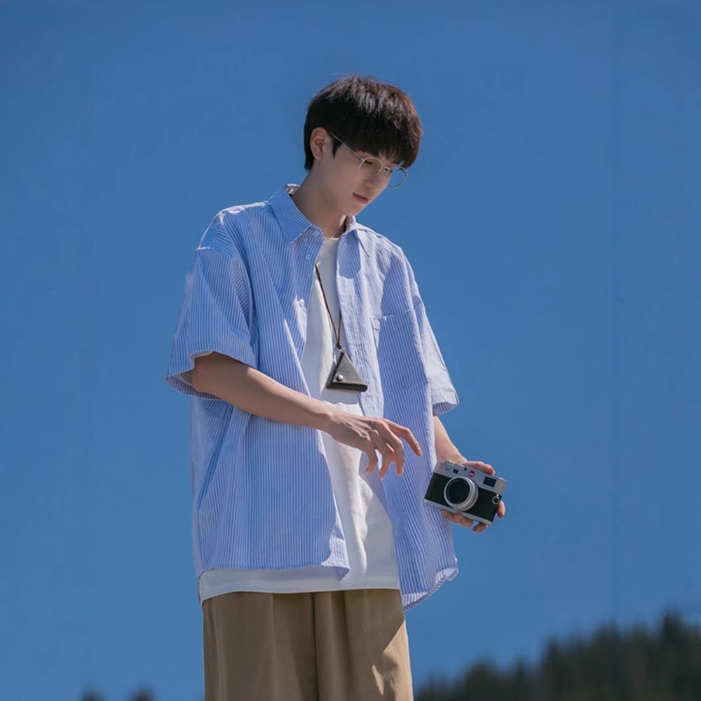 Men's Short-Sleeved Breathable Shirt Concealed Button V-Neck Loose Shirt