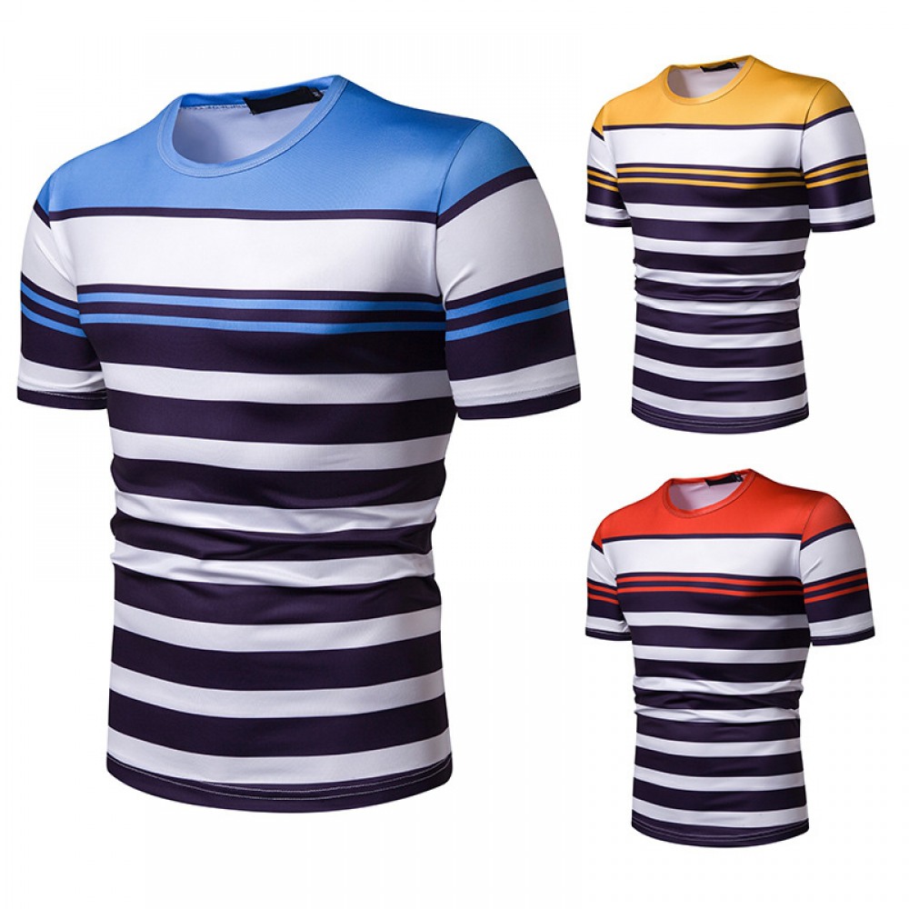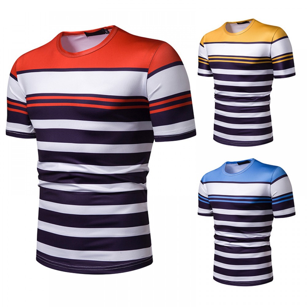 New Summer Men's Short-Sleeved T-Shirt Contrast Striped Slim Casual T-Shirt