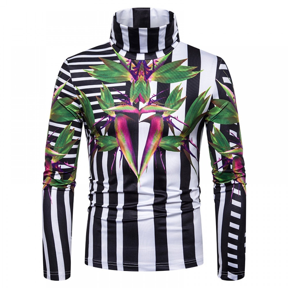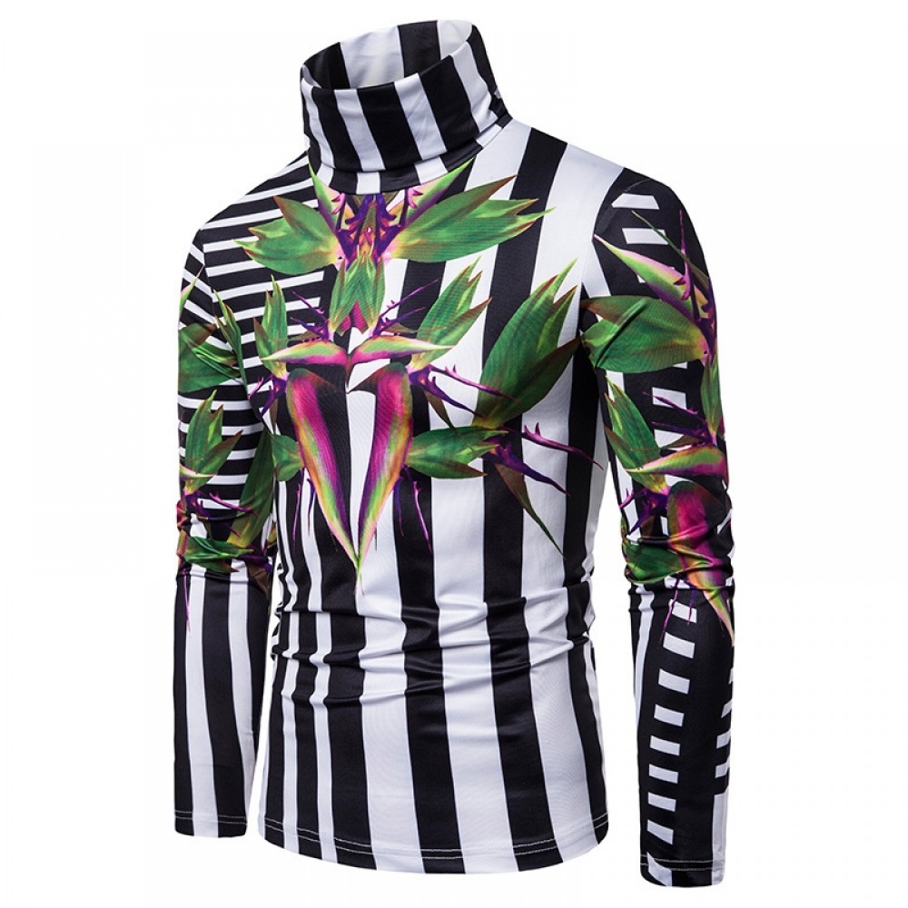 New Men's Plus Size 3D Stripe Printing High Neck Long Sleeve T-Shirt Bottoming Shirt